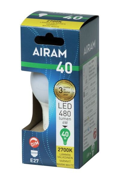 AiramPris 31 kr - Pris 31 krPris31 kr31 kr - 31 krPris 31 krOpal LED-normallampa 6W 2700K E27 470lm 15000h 60 x 102 mm, kartongförpackning. Den opalvita ljuskällan sprider ett bländfritt ljus. Ej dimbar. Pr...